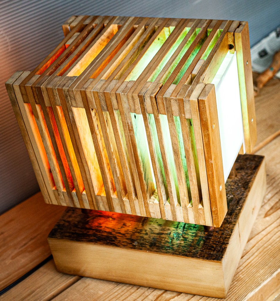 73 morceaux de bois constituent cette lampe qui contient deux ampoules connectées indépendantes, du cuivre, de la modélisation 3D……