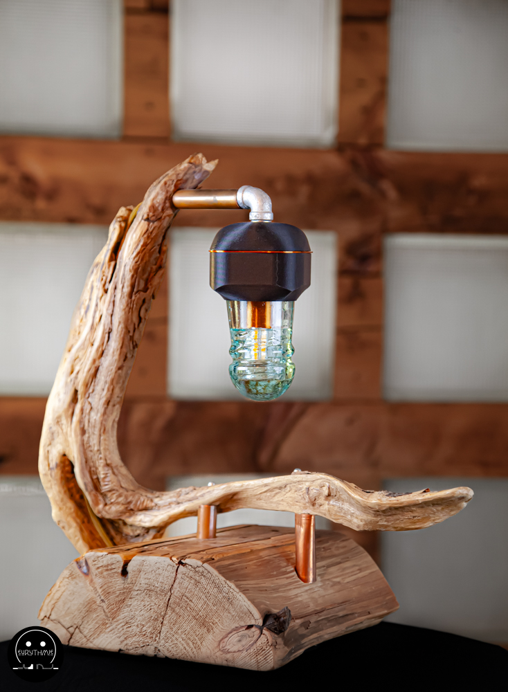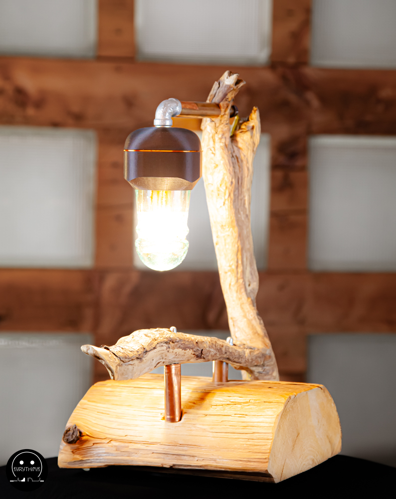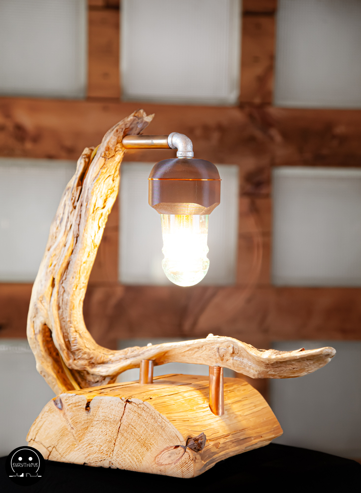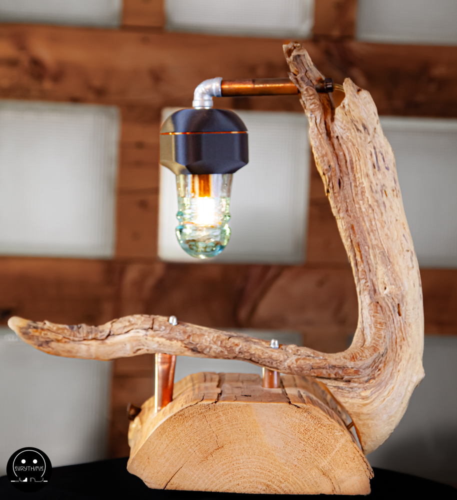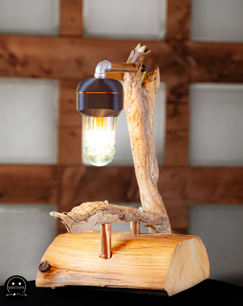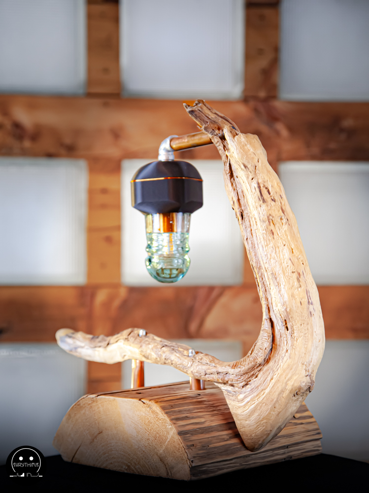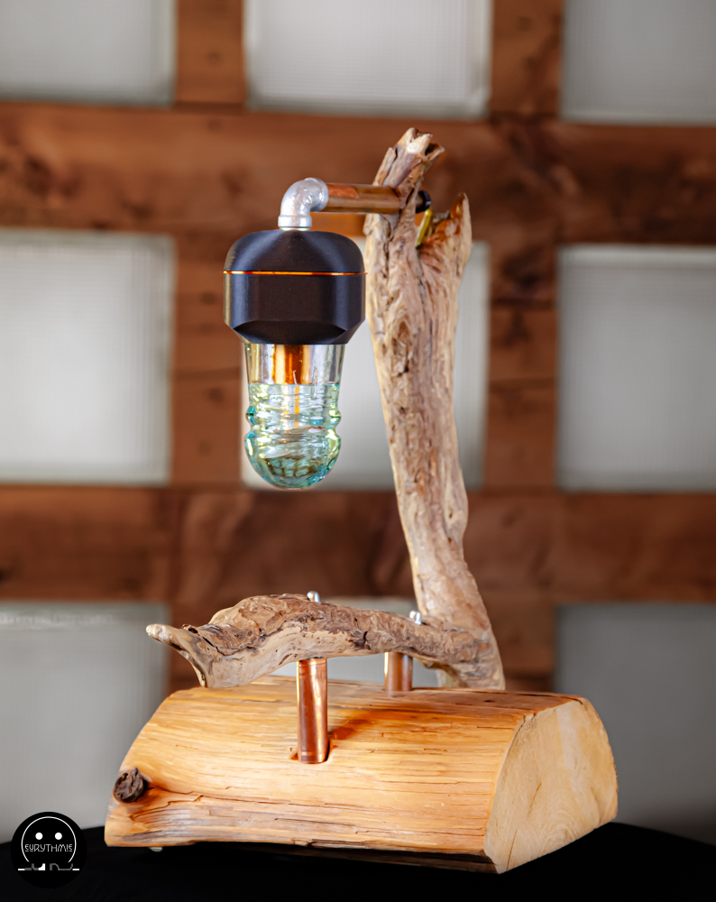 Fabriquée avec du bois centenaire pour la base et en bois flotté pour le support. L’ensemble est maintenu avec des tubes de cuivres.
