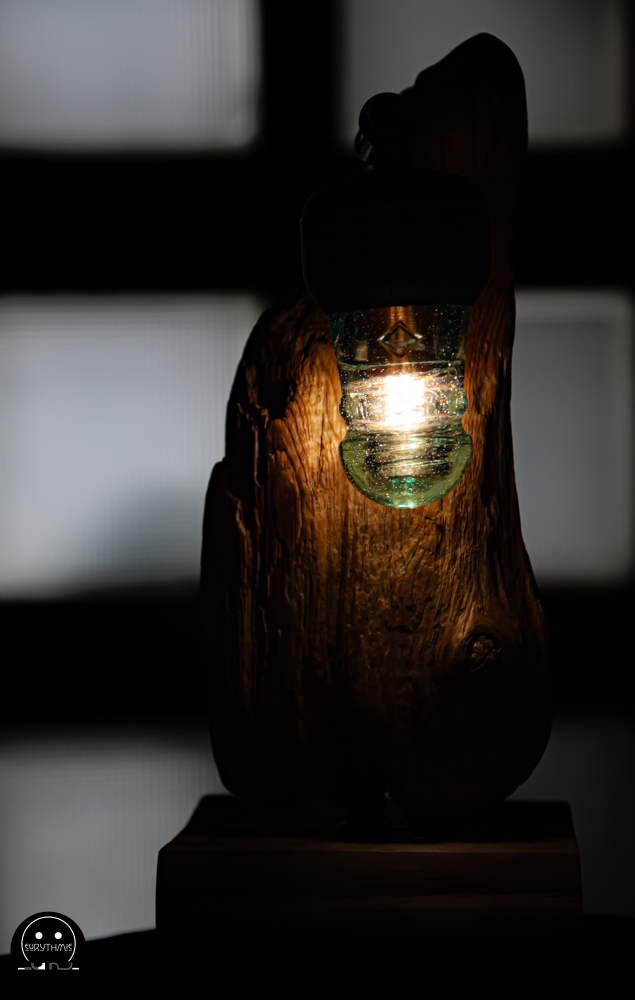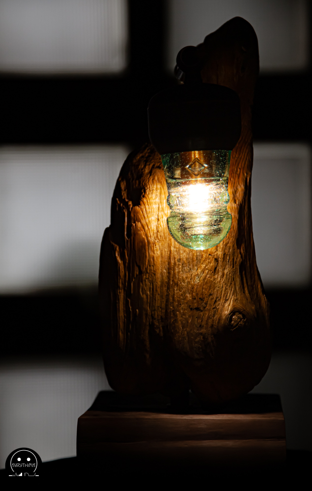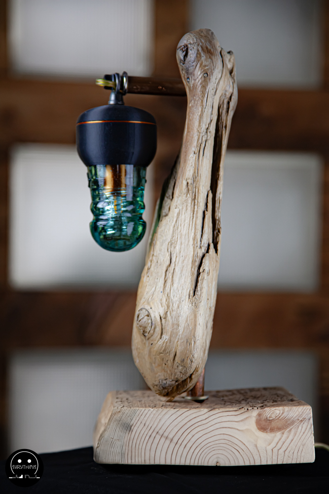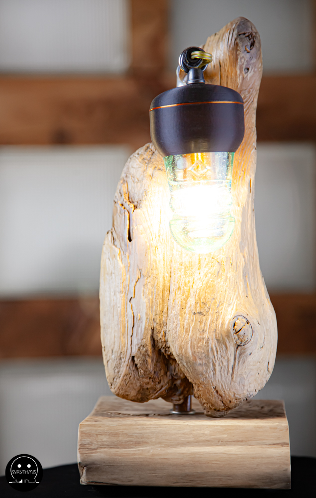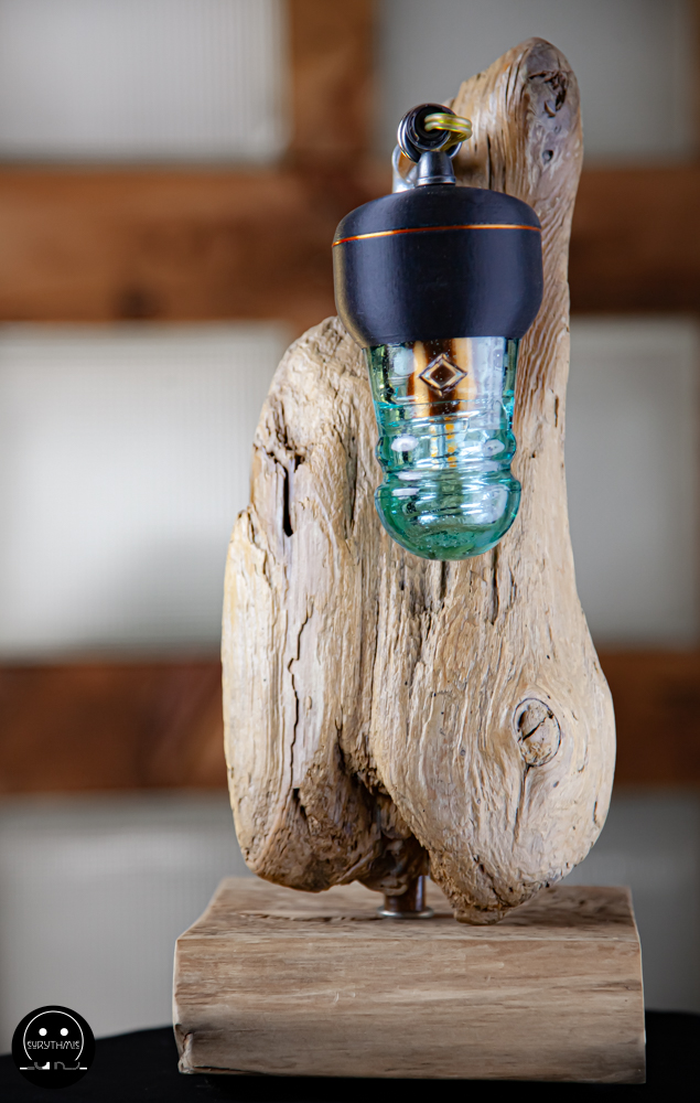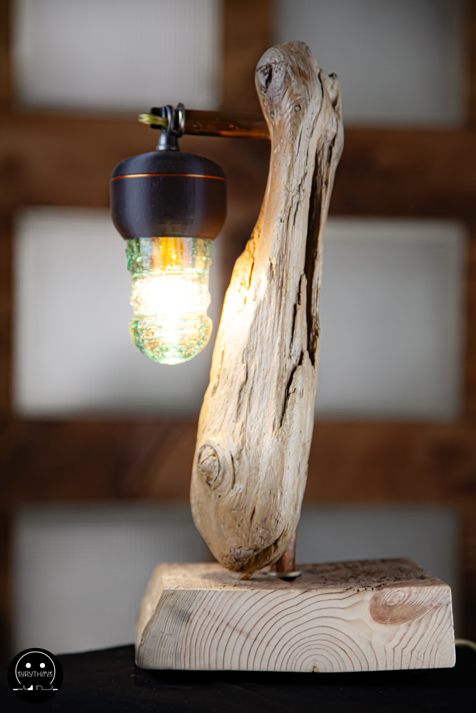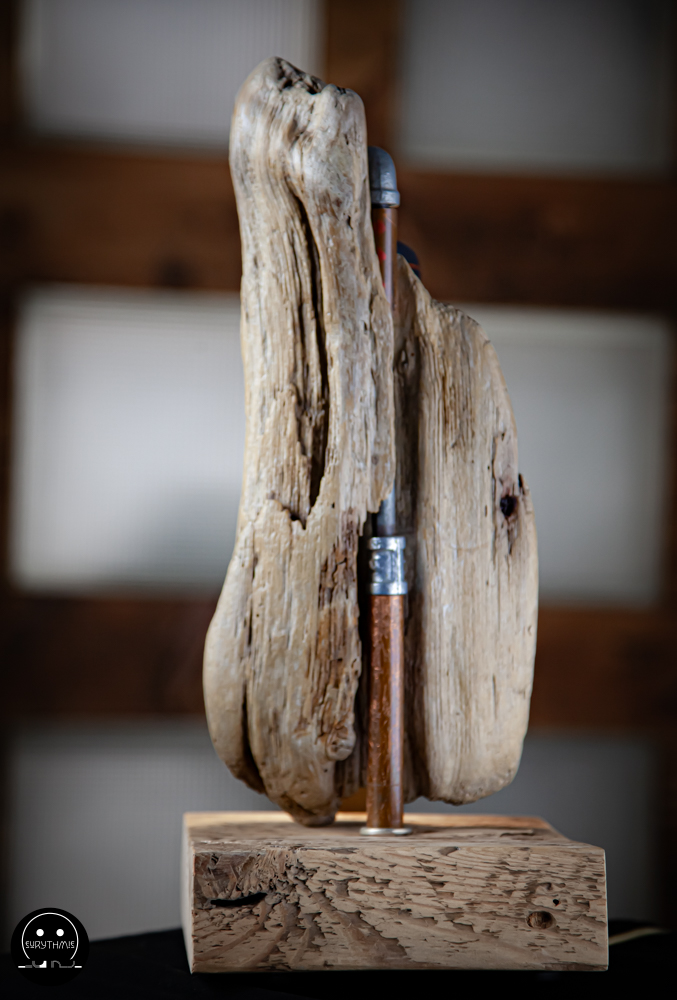 Fabriquée avec du bois centenaire pour la base et en bois flotté pour le support. L’ensemble est maintenu avec des tubes de cuivres.